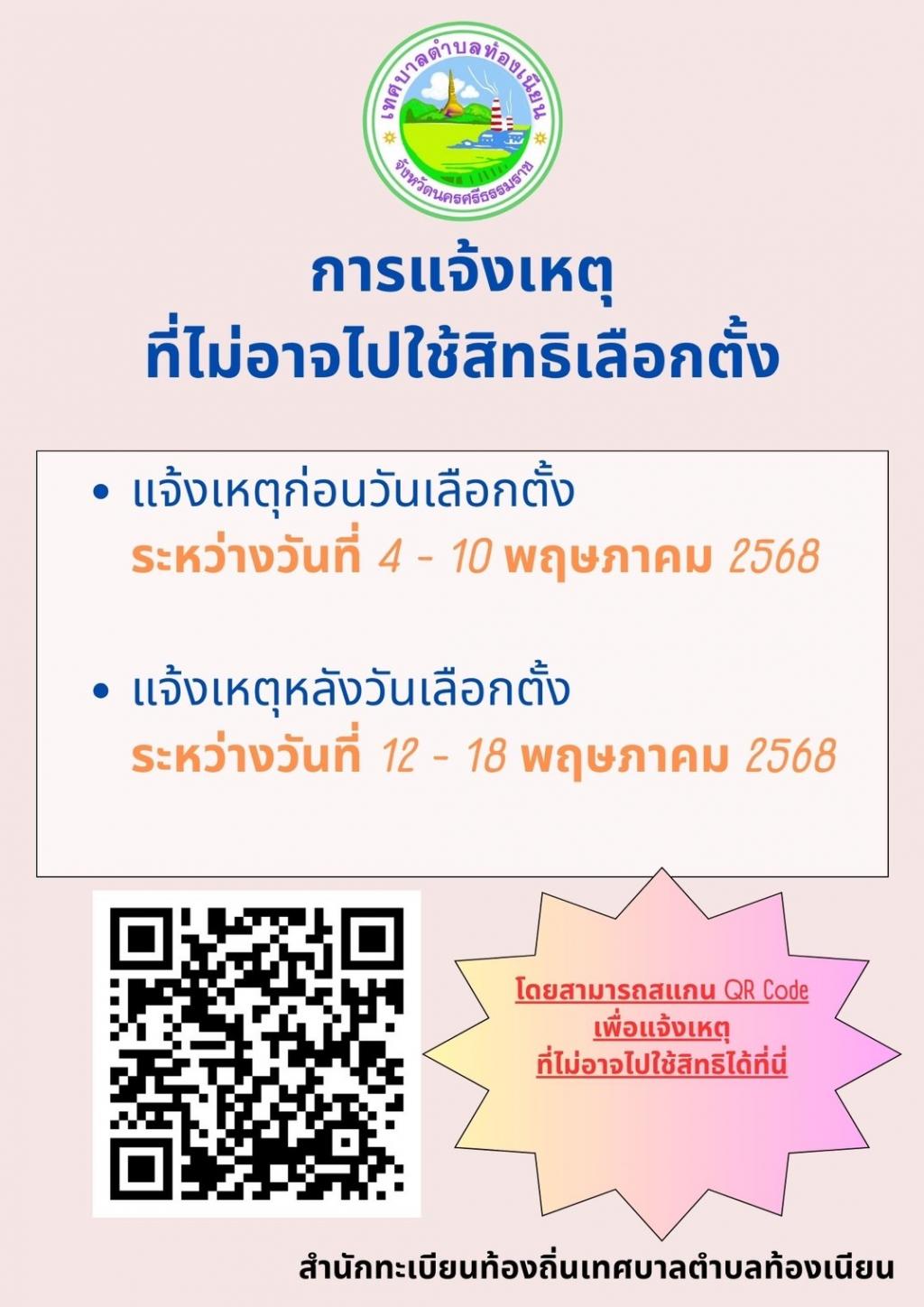 ประชาสัมพันธ์การเพิ่มชื่อ - ถอนชื่อของผู้มีสิทธิเลือกตั้ง และการแจ้งเหตุที่ไม่อาจไปใช้สิทธิเลือกตั้งได้ หากท่านมีข้อสงสัย สามารถติดต่อสอบถามได้ที่สำนักทะเบียนท้องถิ่นเทศบาลตำบลท้องเนียน หรือโทร 075-528711 ในวัน เวลาราชการนะคะ