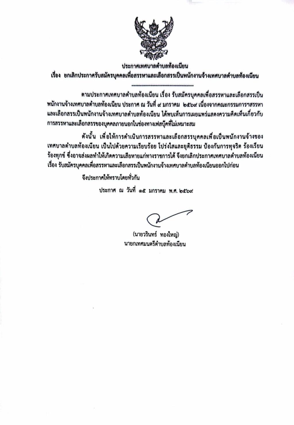 ประกาศเทศบาลตำบลท้องเนียน เรื่อง ยกเลิกประกาศรับสมัครบุคคลเพื่อสรรหาและเลือกสรรเป็นพนักงานจ้างเทศบาลตำบลท้องเนียน...