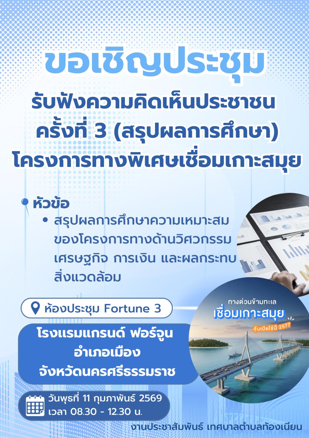 ขอเชิญชวนประชาชนทั่วไปและผู้มีส่วนเกี่ยวข้อง ร่วมประชุมรับฟังความคิดเห็นของประชาชน ครั้งที่ 3 สรุปผลการศึกษา โครงการพิเศษเชื่อมเกาะสมุย...