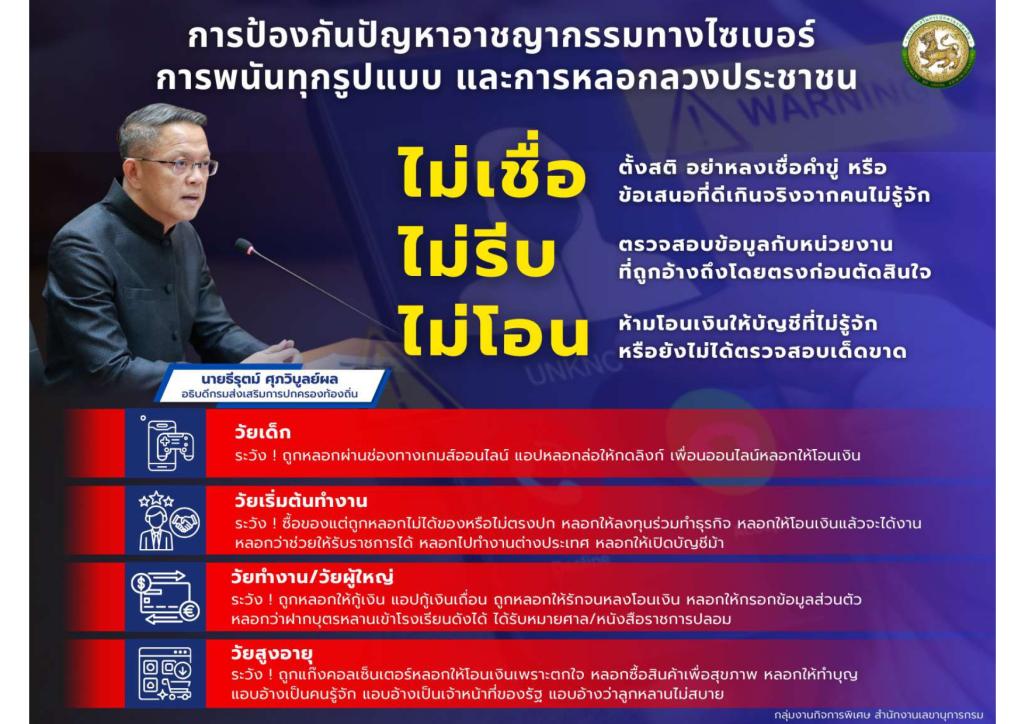 ประชาสัมพันธ์ การป้องกันปัญหาอาชญากรรมทางไซเบอร์ การพนันทุกรูปแบบ และการหลอกลวงประชาชน "ไม่เชื่อ ไม่รีบ ไม่โอน"...