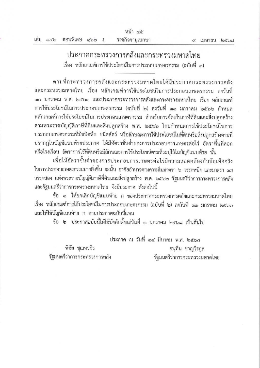ประกาศกระทรวงการคลังและกระทรวงมหาดไทย เรื่อง หลักเกณฑ์การใช้ประโยชน์ในการประกอบเกษตรกรรม (ฉบับที่ 3)...