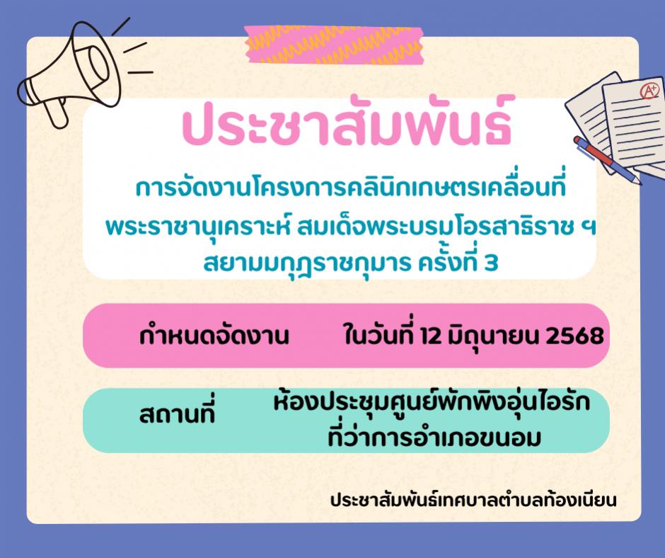 ประชาสัมพันธ์โครงการคลินิกเกษตรเคลื่อนที่ในพระราชานุเคราะห์ สมเด็จพระบรมโอรสาธิราชฯ สยามมกุฎราชกุมาร ครั้งที่ 3 ซึ่งกำหนดจัดงานวันที่ 12 มิถุนายน 2568 ณ ห้องประชุมศูนย์พักพิงอุ่นไอรัก...