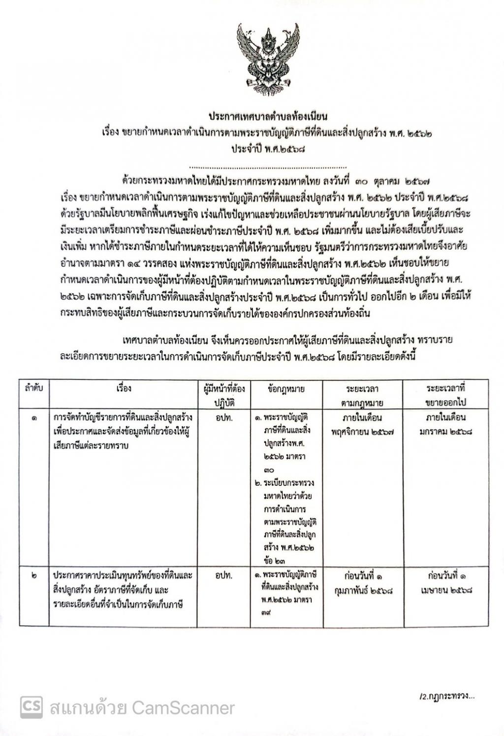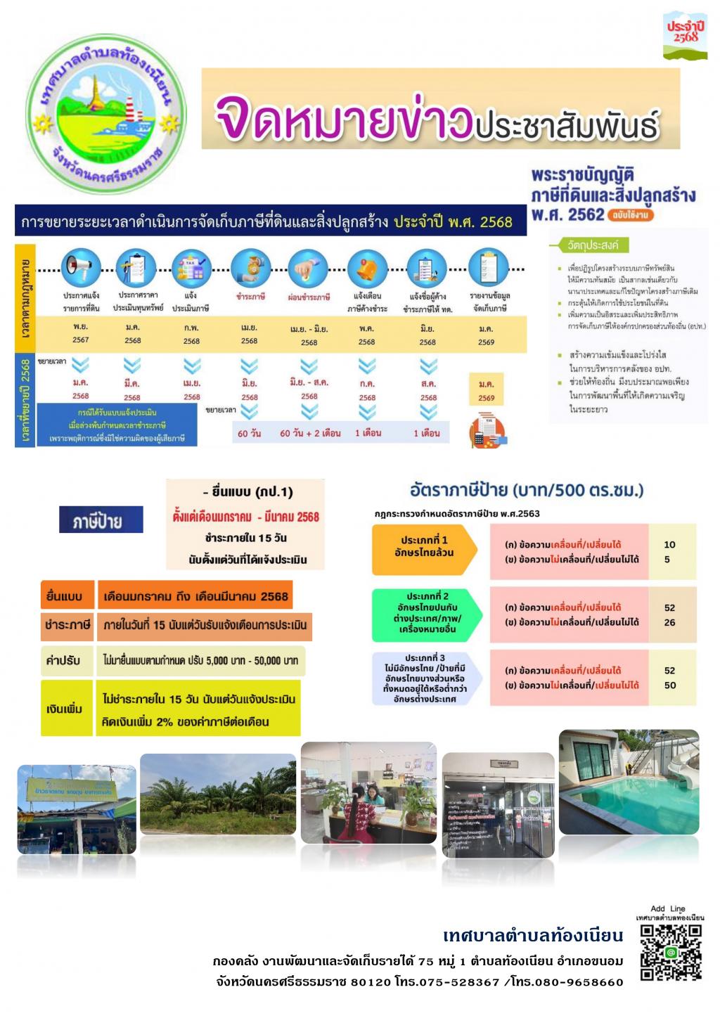 ประกาศเทศบาลตำบลท้องเนียน เรื่อง ขยายกำหนดเวลาดำเนินการตาม พรบ.ภาษีที่ดินและสิ่งปลูกสร้าง พ.ศ. 2562 ประจำปี พ.ศ. 2568...