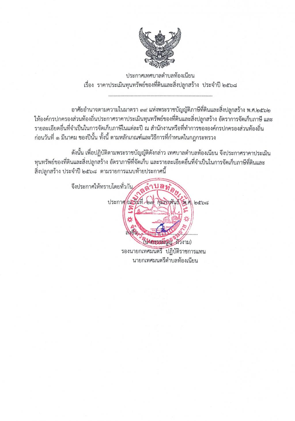 ประกาศเทศบาลตำบลท้องเนียน เรื่อง ราคาประเมินทุนทรัพย์ของที่ดินและสิ่งปลูกสร้าง ประจำปี 2568...